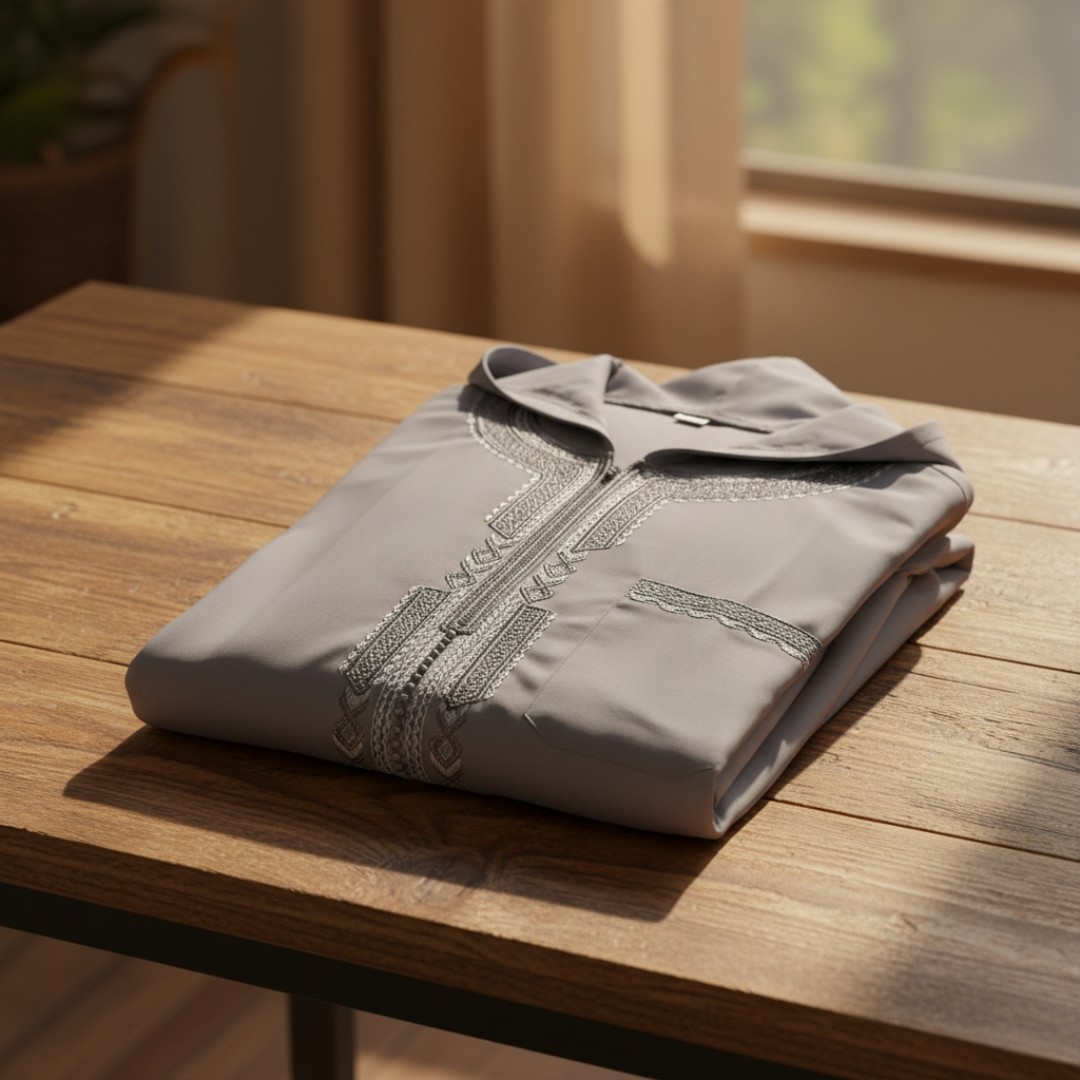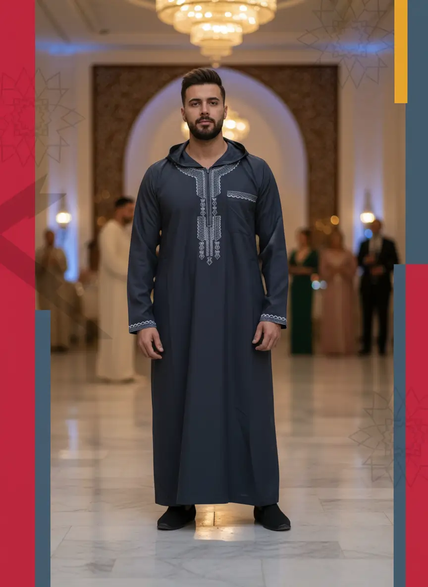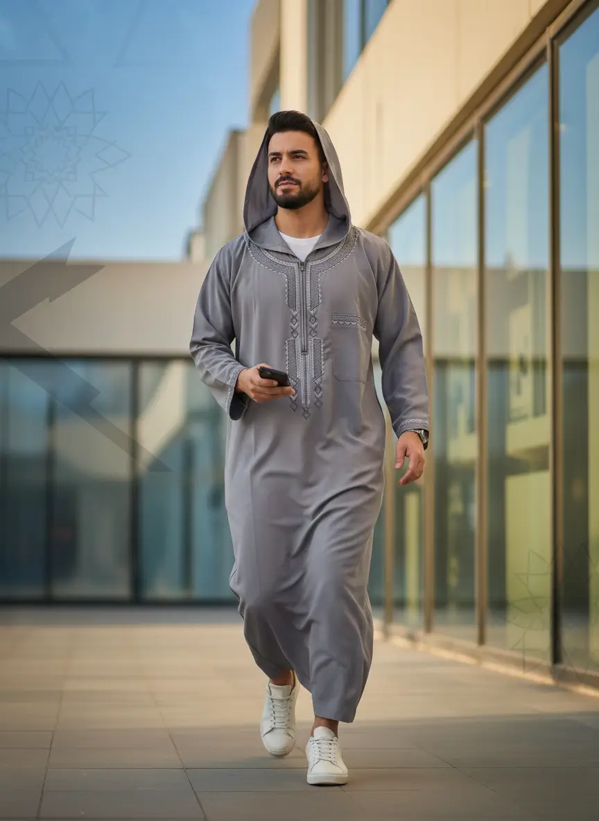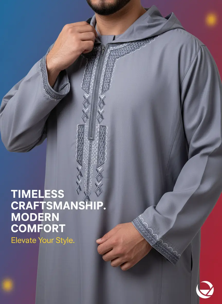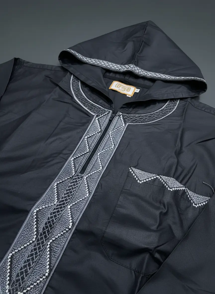 - التصميم: جلابية مغربية بقلنسوة وسوستة.