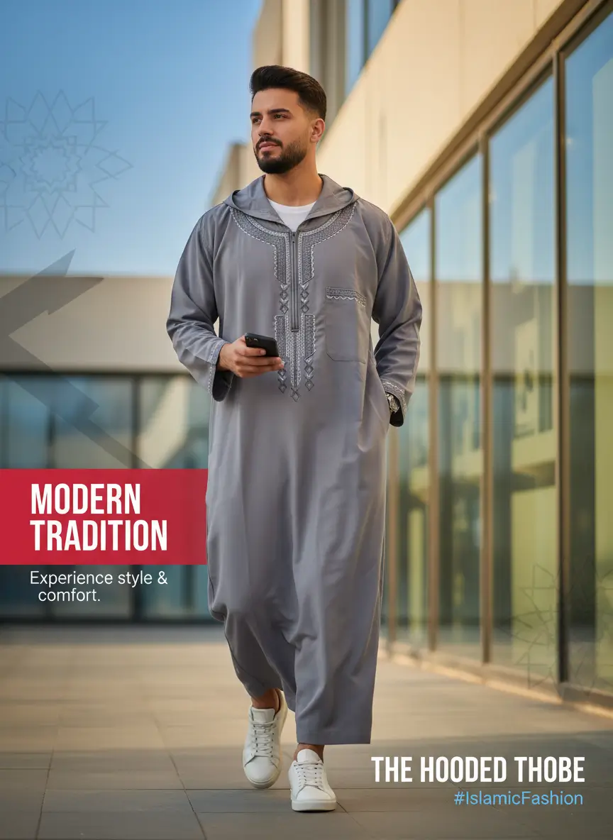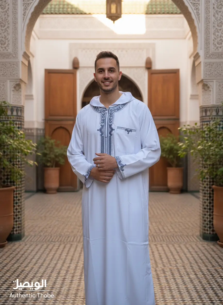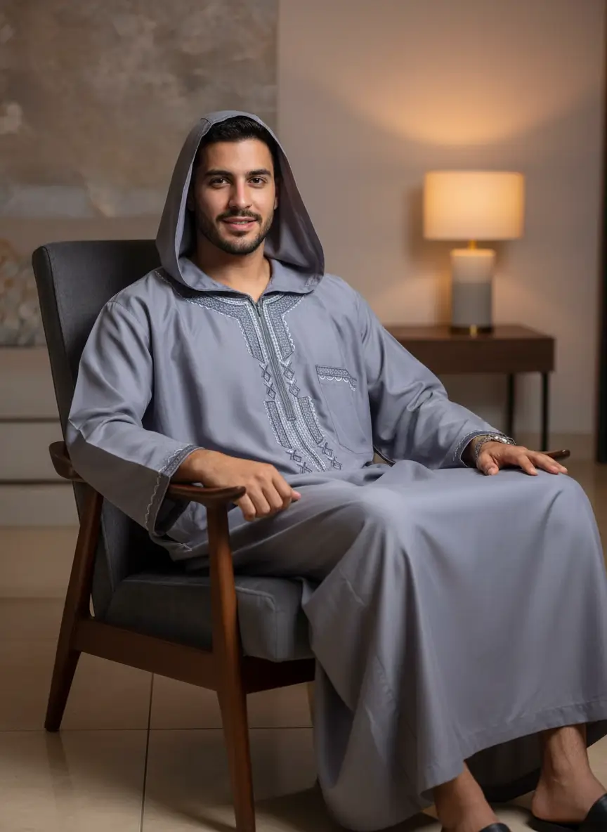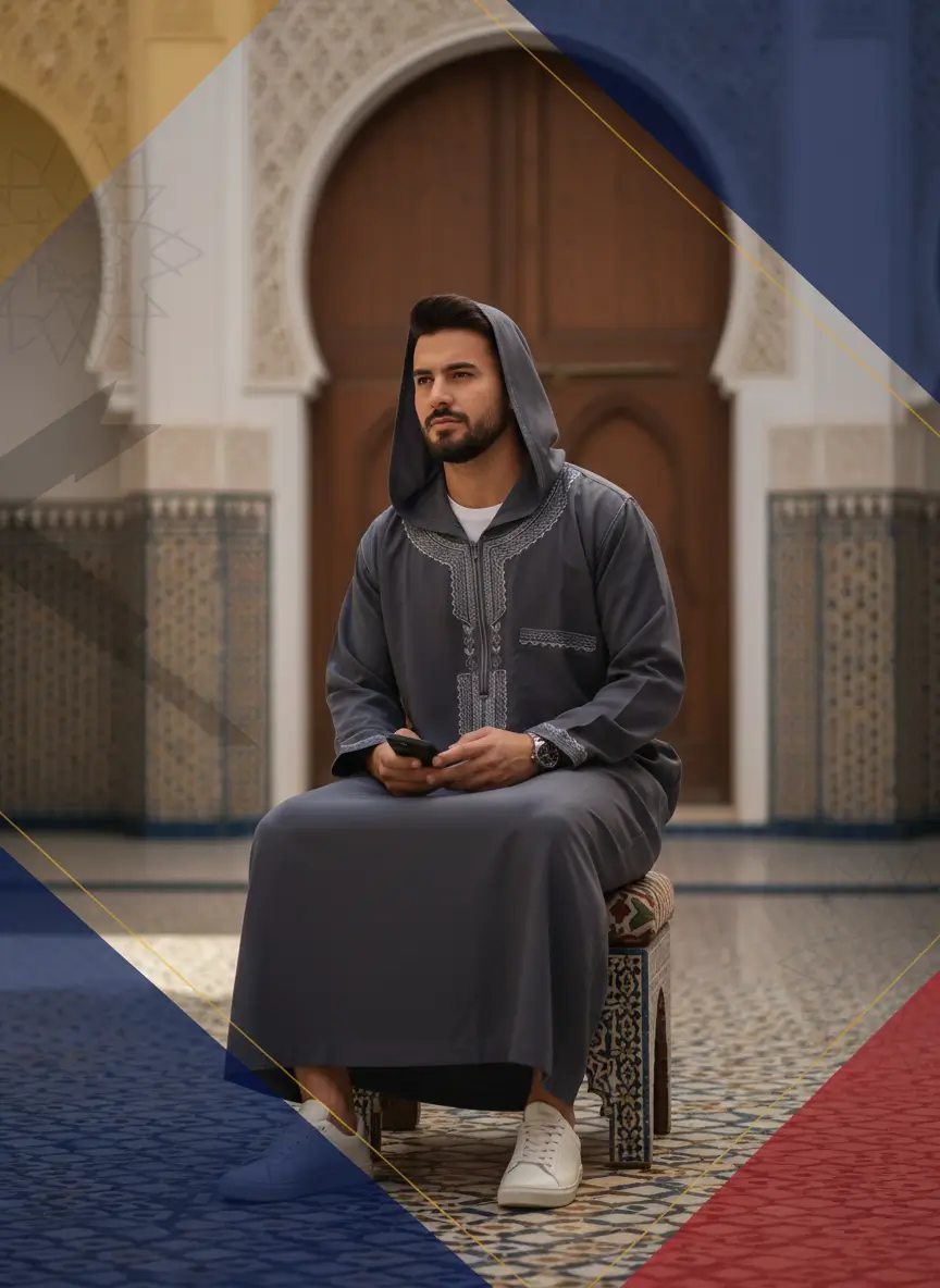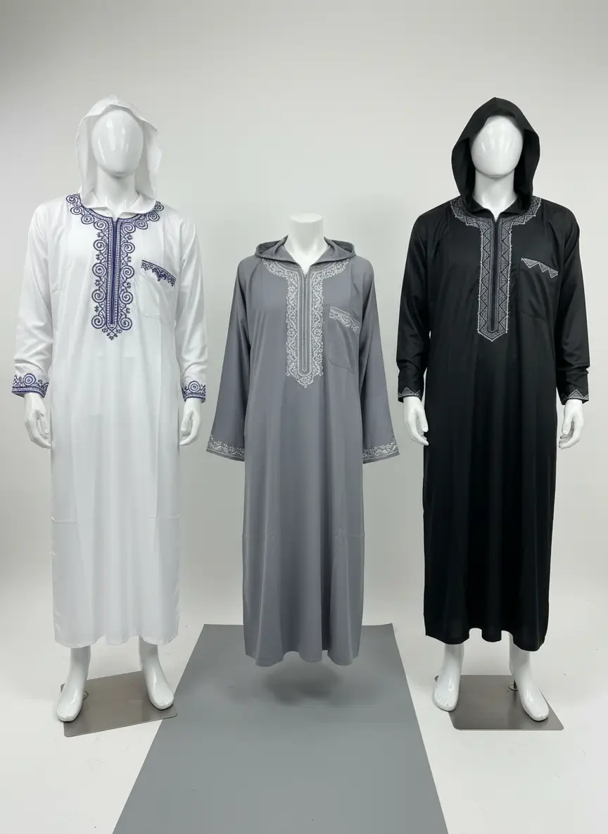- التصميم: جلابية مغربية بقلنسوة وسوستة.