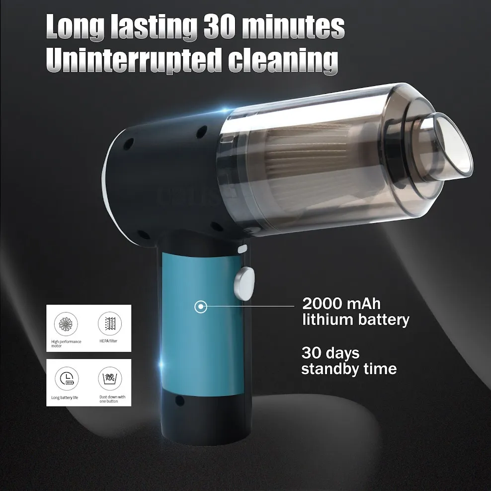 هل تعبت من الأتربة والشوائب في منزلك أو سيارتك؟ احصل على المكنسة الكهربائية الصغيرة اللاسلكية القابلة لإعادة الشحن، والتي تجمع بين الكفاءة وسهولة الاستخدام. مع تصميمها الخفيف الوزن ووزنها البالغ 350 جرام فقط، يمكنك حملها بسهولة في أي مكان.