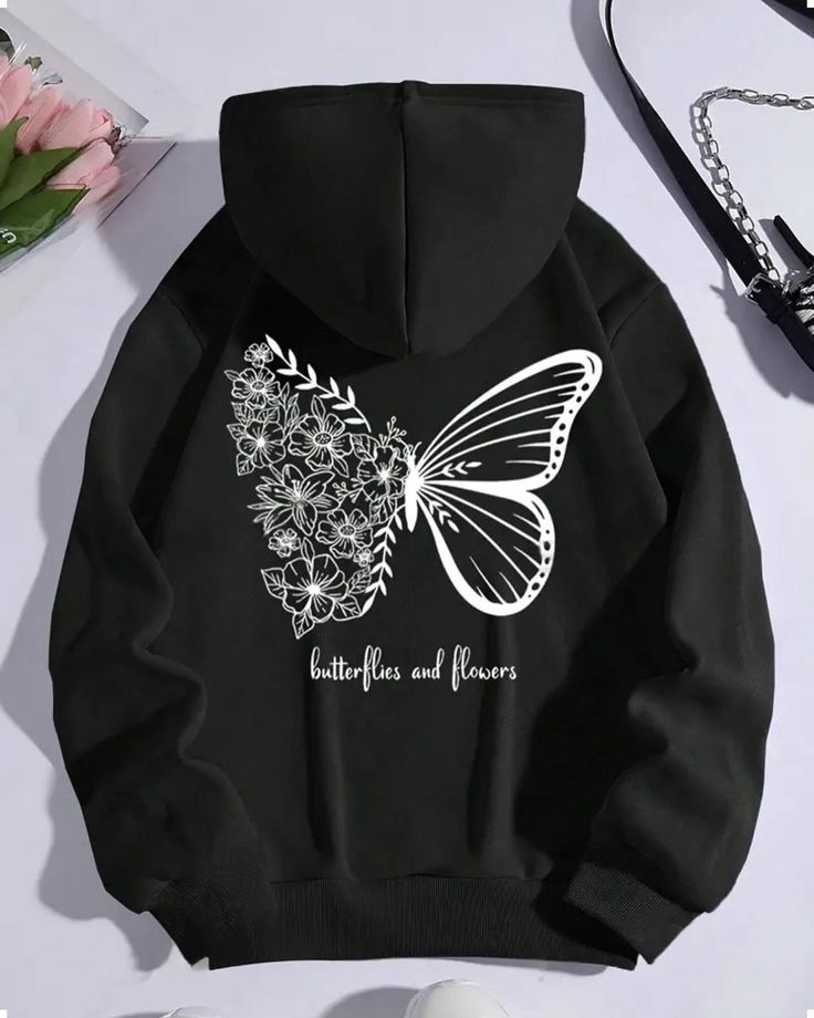 هودي نسائي أسود بطباعة فراشة وزهور من الخلف، تصميم أنيق وخامة دافئة للاستخدام اليومي.